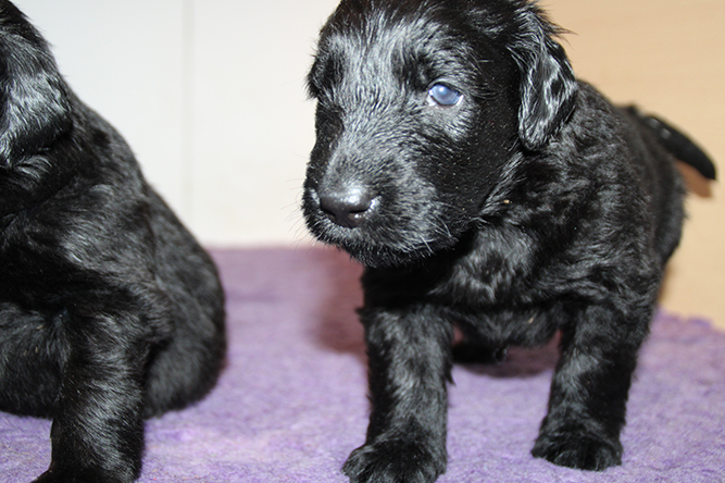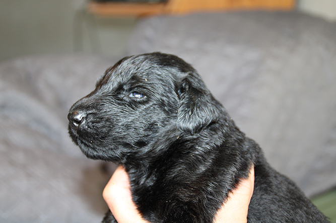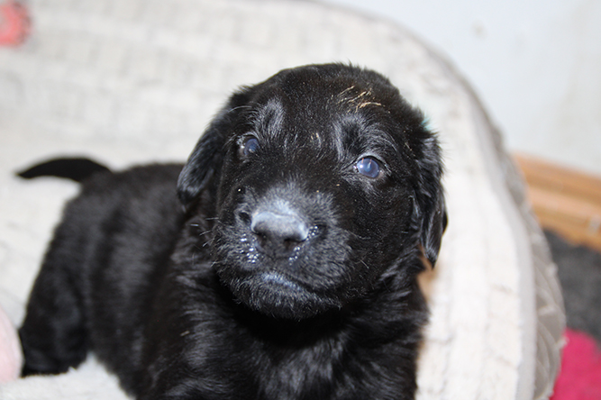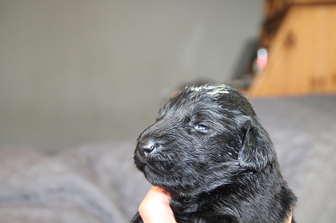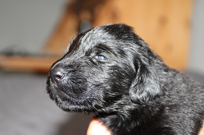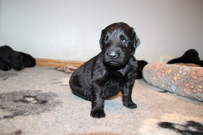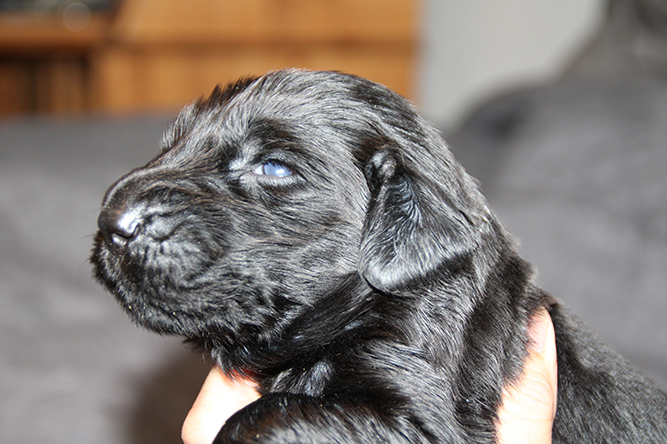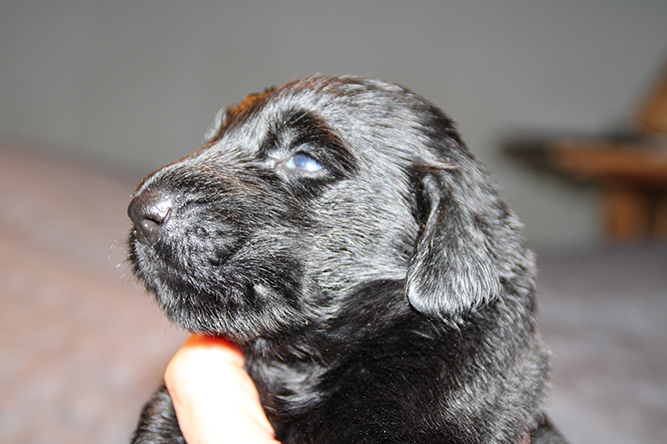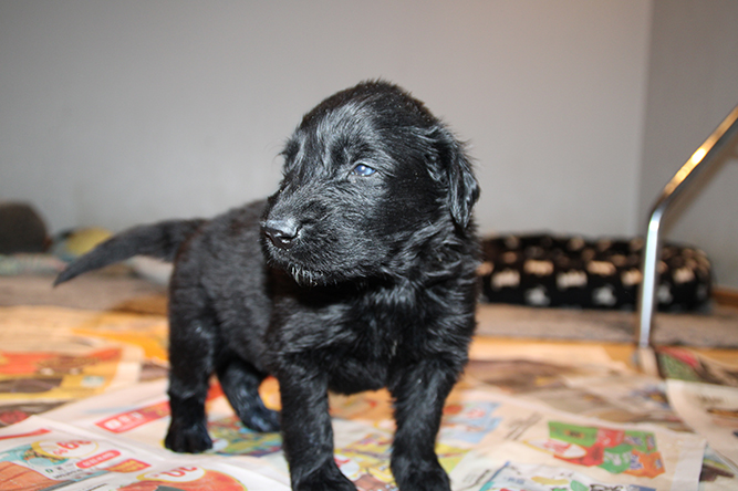 14.10.25. Utviklingen går i 100 her. I dag må vi åpne mer plass . De er blitt sykt flinke til å gå ut på avisene å gjøre i fra seg. I dag skal de få "gressplen" ved døren .jeg skjønner faktisk ikke hvordan folk klarer å ha valper  i en liten valpekasse frem til 3 ukers alder. For her går det unna. De våkner å går helt ned i andre enden av innhegningen sin . Å de vokser så det knaker så det blir jo fort trangt. Hørselen har nå åpnet seg å de hører veldig godt når vi kommer inn i rommet. Da blir det liv :-)Her er gutt halen og gutt hode