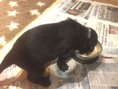 27.09.20 mat i tre omganger falt veldig i smak. Nå tror jeg faktisk jeg må åpne valpe kassen enda mer så de får større plass å bevege seg på her :-) I går gikk onkel Scott . Emma bror på jakt prøve og fikk en meget god 2 premie. :-) Kjempe gøy. Tror Emma gleder seg til hun kan jobbe igjen også. Hun byr villig frem ballen og lurer på om vi skal gå ut å gjøre noe når små trolla sover . Her er Guttnakke og jente halen.