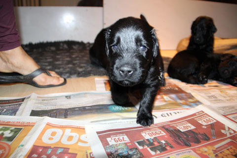 15.10.20.Da er alt i orden med registrering av valpene i NKK. :-) Når vi forhånds registrerer alle og betaler inn dette så har alle valpene en valpe forsikring i agria fra 5 uker gamle. En god trygghet å ha med seg. Når vi så videre fører denne forsikringen i Agria til hver valpekjøper når de flytter så slipper man karenstid hvis noe skulle skje når man får valpen med seg hjem. Det er fort gjort å klemme i en dør o.l . Å da et det veldig viktig at man har en forsikring som funker med en gang :-) Veterinær er kjempe dyrt . Her går mat og makulering av aviser så det suser. For makulering . Det er siste mote akkurat nå. Dere skulle bare vist hvor gøy det er å se hvor mange små biter man kan gjøre en enkel avis om til :-) Her er Bine og gutt halen/ Alfred