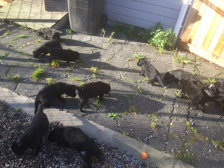 25.10.20 . Kjempe gøy med besøk her i går :-) Det yrer når det kommer folk nå. Det yrer når jeg skal tørke over gulvet også skal jeg si dere :-) Det blir jo fort litt møkkete når de fyker ut å inn å graver og ordner i litt vått vær ute. Men jammen er de flinke til å hjelpe til alle 11. Vaske gulvet har jeg funnet ut at det må jeg gjøre når jeg sperrer de ute :-)Gå tur i den store verden. Det er det mest morsomme nå :-) Merker at det nærmer seg at de er klare for egne hjem og sine egne familier nå. Her er Charlie og Lava