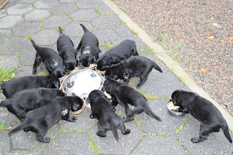 20.09.20 Nå gløtter alle så vidt det er på den store verden. De er bare helt til å spise opp. Nå må snart åpne valpekassen mer. Det begynner å bli trangt her :-) Emma og jeg er fremdeles ikke helt ening når det er normalt å spise frokost. Hun var meget sikker på at det var tiden kl 2 i natt. Hun tapte . :-)Her er Jente rumpen og gutt rumpen.