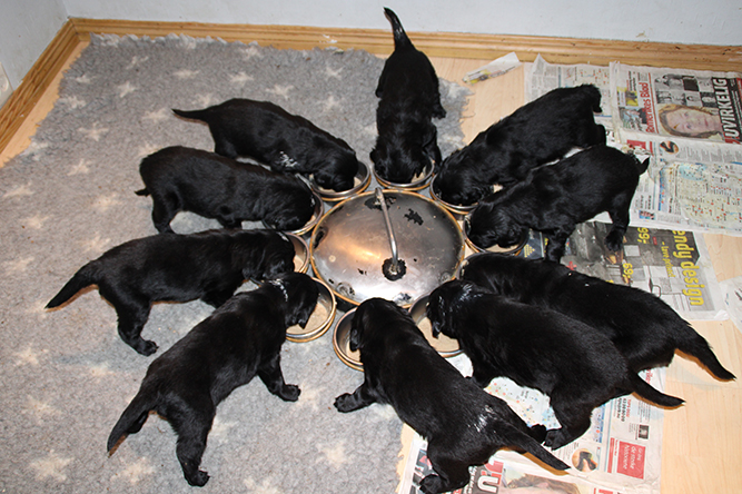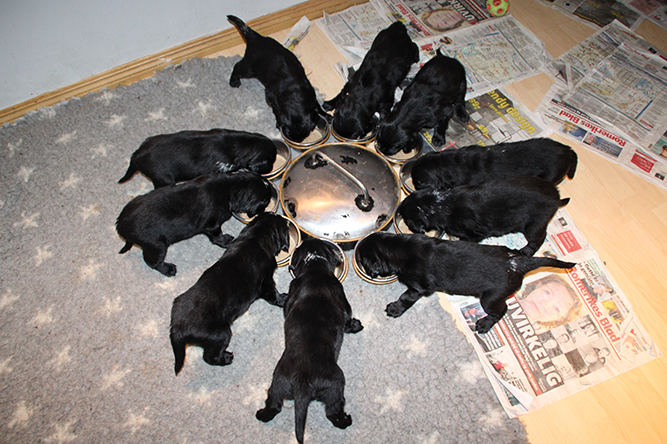 13.12 20. I dag er de skjønne Dansende blitt 4 uker. Ny runde med klo klipp og vekt sjekk :-)Vi klarte med gode rutiner å få til to koselige besøk i går. Trolla stor kosa seg med nye mennesker å kos :-) I dag skulle vi hatt et besøk her men det er avlyst så er det andre som skal ha valp som har lyst å komme i dag så er det bare å ringe :-) Kalenderen er så full her at vi utnytter hvert lille ledige hull :-) Her er jente rumpe og gutt rumpe og alle i mat fatet :-)