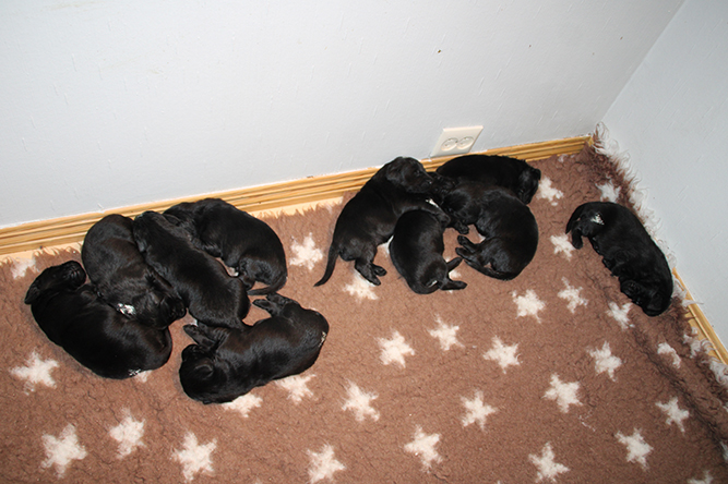 25.11.20 Ingen har begynt å glippe med øynene enda. Men øyen sprekkene blir mer å mer markerte :-) Dette er så spennende :-) Det er fart i de små kroppene nå. Ikke lett for Allora å legge seg ned når hun skal det. De aker seg bortover så hun må værekjapp med å legge seg ned når hun går opp i valpe kassen :-) Her er Jente merket fremfot og gutt merket bakfot