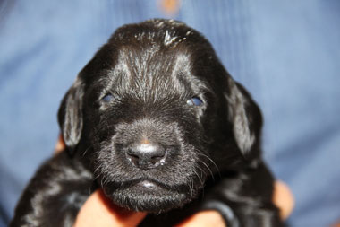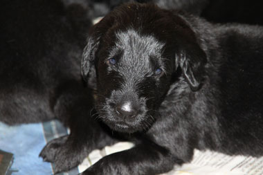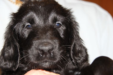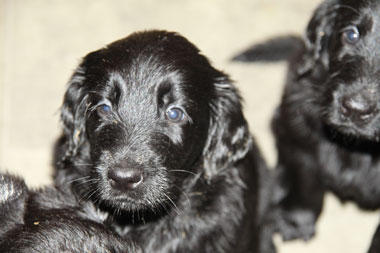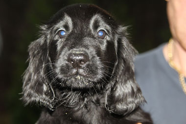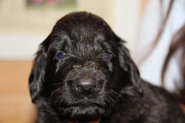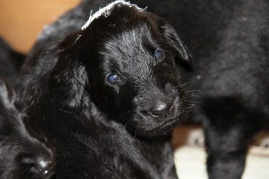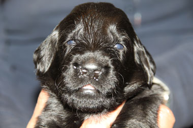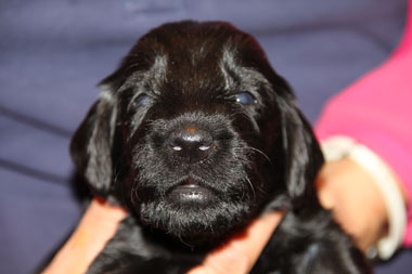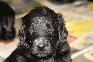 03.10.14. Nå har alle åpnet øynene.Alle har lyseblå øyne i starten og denne fargen går sakte over mot grå nyanse før alle valpene tilslutt får nøttebrune øyne. De første dagene når de har åpnet øynene så ser de ikke så mye tror jeg . De skimter nok skygger og beveglser men ser nok ikke helt klart med en gang . Her er Maya & Nero Begge glipper med øynene men synes blitzen er litt skarp :-)