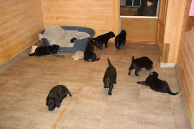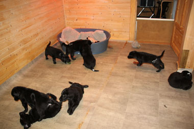 03.11.14. Vi har begynt nå å fordele valpene. Gutta ble vi ferdige med i går så nå går vi gang med jentene. Så fort vi har bestemt oss så legger vi ut alle med riktig navn :-) I går regnet det bøtter det meste av dagen. Men trolla hadde 4 familier her på besøk så de fikk nok å gjøre alikevel :-) Så de sov godt i går kveld. Her er Chania & Nero