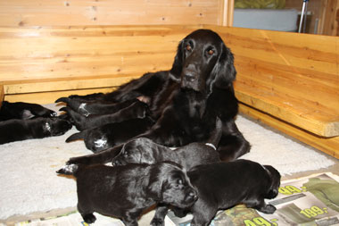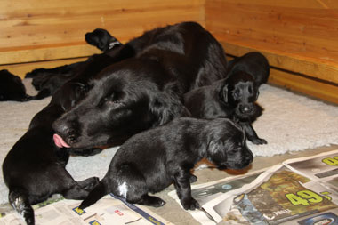 14.10.14. Kjell kom hjem igjen i går kveld etter å ha tilbringet dagen på overvåkningen på sykehuset. Foreløpig er det ikke funnet ut noen ting. Natten har heldigvis gjort litt å han er litt bedre form i dag.:-)Valpenen tar livet med stor ro mellom melk grøt og kos. I går fikk de 4 små måtider. Det falt i god smak.I dag får de nye besøk her i løpet av formiddagen.Så de koser seg godt.Her er Freddy & Flax
