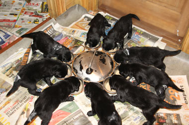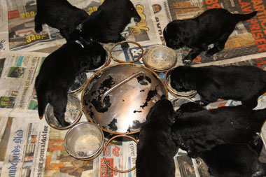 18.10.14 . I ettermiddag reiser Marianne ,Zaga,Aqua og jeg på tur til Sverige for å møte Zaga s kjæreste Moltaz. Blir spennende dager dette. Men det er jo helt fælt å ikke kunne ta med 9 er banden her. Kjell blir her hjemme å passer valper,hus og resten av hundenene og for ikke glemme Kattene Tiril og Mie :-) Så trolla er i trygge hender men jeg er borte. Valpedagboken blir lagt ut i morgen . Den gjør jeg klar i ettermiddag. Men så blir det ikke nye bilder her igjen før tirsdags morgen .Hvis vi da er kommet hjem igjen til da :-)De er blitt så flinke med bordskikken sin nå de sjønne små. Står pent å spiser av hver sin skål. Her er alle i matfatet så er det Titla & Flax