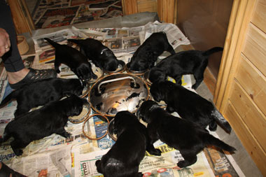 22.09.14. Natten har vært stille og behagelig. Men jeg har jo vært oppi valpekassen i hvertfall 6 ganger for å sjekke at alle har det bra.Vi bytter på å sove ved siden av valpekassen de 3 første ukene slik at Mollie har selskap. Mollie er veldig rolig så hun takler 9 små troll elegant :-)Synes det er litt lite melk hun gir foreløpig ,men håper det kommer seg opp ganske så fort. Alle små trolla fikk litt ekstra fra meg i dag morges. Dette falt veldig i smak. Vi har det veldig rolig i huset her nå med minst mulig besøk slik at Mollie og valpene får den roen de trenger sammen nå. Her er Gutt merket rumpe som sjekker ut om det er melk i min finger & Jente merket rumpe Kita som sover godt :-) Så er det alle i melkebaren. Det er vi som har malt de med hvite prikke forskjellige steder på kroppen for å kunne følge hver valp spesielt :-)