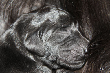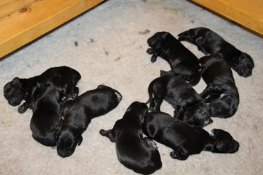 24.09.14. I dag er trolla blitt 3 døgn gamle.Det ser ut som om melken har begynt å komme slik den skal.Det hadde vært kjempe deilig å slippe å flaske en gjeng på 9 hver 2 time hele døgnet .Så vi krysser det vi har for at det nå strømmer på i mengder. I hele natt har Mollie vært ut og inn. Litt løs i magen,men tror det meste bero på at hun kjedet seg litt når trolla sov og hadde lyst og ut å grave seg en hule som fremtidig hybel til sine små. Jeg måtte jo bare bli med hver gang hun stod ved døren i tilfelle hun måtte på do. Kjenner jeg er ganske så slutt kjørt nå av mangel på søvn. Trolla vokser og trives godt. Det er så fasinerende å sitte å se på de når de sover. de strekker seg og viser så herlig velbehag :-)Her er alle sammen så er det Jente merket nakke = JN Maya og Gutt merket nakken = GN Nero