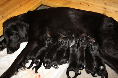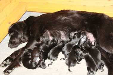 21.09.14. Nå har vi holdt på her i hele dag og jeg tror det er tomt med valper i Mollie. Men hun har 3 morkaker som ikke er kommet ut enda. Hun har små veer så vi kan jo få en overaskelse med en valp til , eller at det er morkakene som blir skjøvet ut :-) Mollie tar det hele med en stor ro. Valpene er kjempe jevne i str. ,og store ,blanke og fine.Mollie slipper faktisk ned melk allerede til de når de drikker. Hun er bare så flink :-) Med 9 valper er det bare helt supert for Mollie har 9 pupper så nå er det en til hver :-)