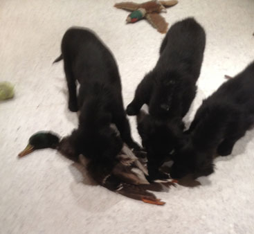 01.02.16. I går fikk Lennox, Norah og Rocky hilse på en død and. Det var rare greier. De snuste og dro litt i vinger . Prøvde å få den i lek men den ville ikke det gitt :-)Ellers er de for det meste i stua og det er et øredøvende leven når jeg setter de inn på vallperommet for å få gjort noe. Ikke populært i det hele tatt kan man si. Både Linus og Max har slått seg fint til ro i sine nye familier. Det eer så deilig å høre. Her er er Rocky og Lennox ,også er det alle tre med en and.