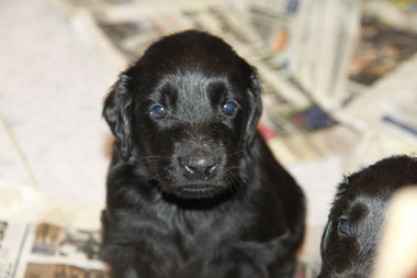 23.12.15. I går kveld var det tiden for å åpne valpekassen. Nå var de på vei over kanten :-) Så nå har de fått aviser foran teppet sitt slik at de kan begynne å gå på do selv . Foreløpig får de forparten over på avisen så tisser de. Hvem kan vel vite at kroppen er så lang da. :-) Nå får de smake litt valpegrøt to ganger hver dag. Det er så godt :-) Her er Lennox og Max.