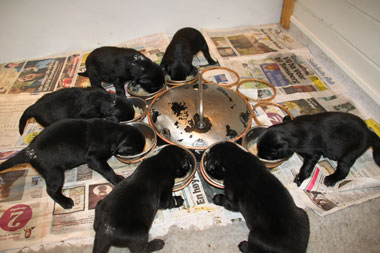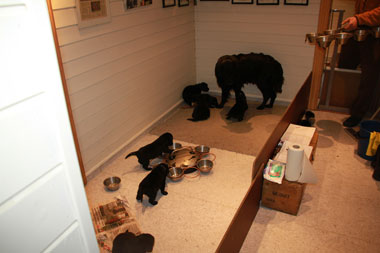 30.12.15. Trolla fikk mat fra skål alle samtidig i går. Det gikk faktisk lettere en jeg hadde trodd. De stod med litt hjelp som perler på en snor. Så nå er det mat samlet videre. Vi åpner valpekassen enda mer også i dag så de får større plass :-) Her er alle som spiser så er detLennox og Max