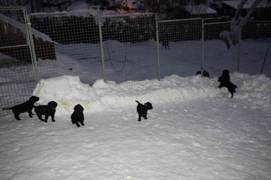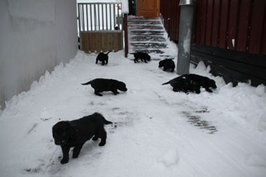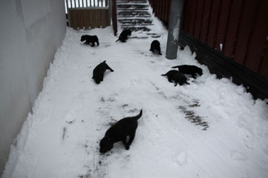 18.01.16. Tenk i dag er Magiske blitt 6 uker gamle. Klo klipp og vekt sjekk står på menyen i dag.Kjell og jeg satt de på bordet i går kveld for å se hvordan de nå stod. Fantastisk flotte alle sammen. Det er så gøy :-)Kjell brøyet hele hagen i går og jeg tok med alle Magiske trolla ut mens han holdt på. Så klart i hundegården. Det var ganske så høy lyd fra traktoren men det brøy de seg ikke noe om. De var bare nysgjerrige på hva som skjedde der ute :-) Ganske så trygge små troll kan man si.Her er Linus og Norah