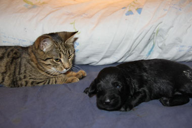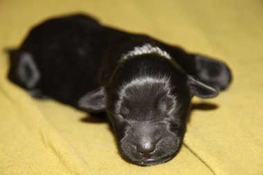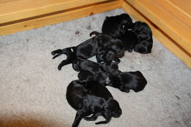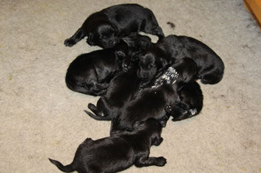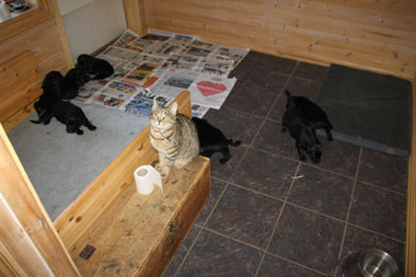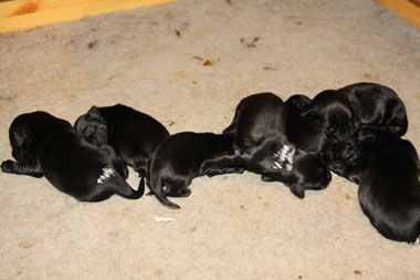 25.01.11. Nå er trolla blitt 1 døgn gamle. Det er alltid spennende de første dagene om alle er utviklet godt nok til å henge med. Nikita tar sin mamma rolle med stor ro. Hun er en kjapp tur ute å gjør i fra seg ellers så vil hun helst være hos sine skjønne. Det er 8 pupper og 9 troll men det ser ut til at det går bra foreløpig når Nikita ligger der så masse. Vi er litt bekymret for den minste gutten.Han legger på seg, men Nikita legger han hele tiden i min seng. Han klynker litt så det kan være litt kolikk smerter. Har gitt han litt dråper mot dette så vi får se hvordan det går. Alle er så utrolig silkesvarte og bare helt til å spise opp. Her er alle sammen. Så er det Cleo & Saiko.