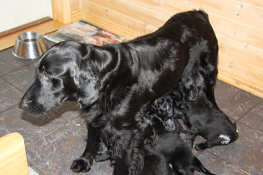 17.02.11. Maten er god og for ikke glemme melken til Nikita. Hun har så masse melk at det er helt skummelt. Har gått ned på maten hennes ,men hun er en melke maskin uten like. Hun elsker å ligge med valpene sine også når hun legger seg, så heldigvis tømmer de puppene hennes godt. Etter melken blir hun liggende å vakse å dille med små trolla sine. Hun er ganske så rar når det kommer lyder på baby callingen. Noen lyder ser man at hun tenker ja det der det var bare mas. Så plutselig får hun fart på seg og forsvinner inn på valpe rommet. Da er det tydelig en lyd som betyr at hun må ordne Her er Saga & Zalto