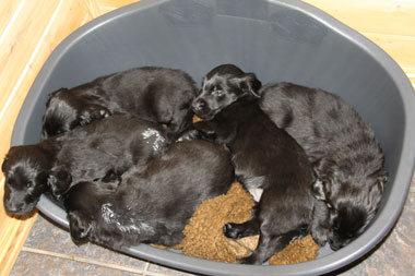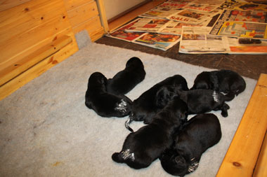 08.02.11. I går kveld åpnet vi valpekassen også. Det begynte å bli veldig trangt om plassen for små trolla. De vakler rundt å synes verden er blitt kjempe stor. Deilig for Nikita også med bedre plass å røre seg på når hun ligger med trollungene sine. Her er alle som drikker melk. Det er noen herlig tykke små troll. Så er det zALTO & Mie som synes det er så gøy å ligge sammen med valpene. Hun kan ligge slik i times vis å bare se. Så er det Lea