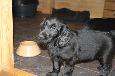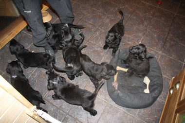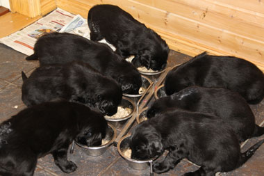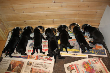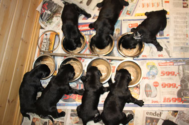 14.02.11.3 uker i dag å tiden er moden for ny klo klipp og mark kur. :-)Her er trolla med sitt nye stativ. Mye lettere å spise pent år matskålen står rolig :-) I går begynte så vidt leken valpene i mellom. Det er så utrolig gøy å se på de når de sitter å prøve å bite i hverandre ,men er så ustøe at de detter overende. I går hadde U gjengen sitt første besøk. De koste seg med å sitte i fanget å få litt kos. Men der jo små enda da så de sovnet fort igjen. Her er Cleo & Zalto. Så er det alle i matfatet.