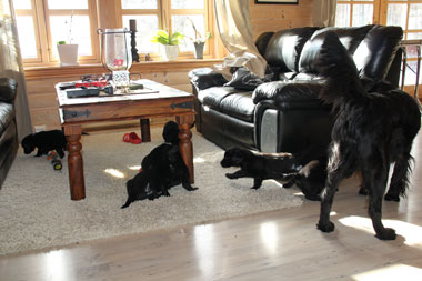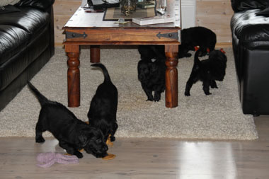 06.03.11. I dag er Kjell avgårde på utstilling på Hamar. Jeg skulle vært med jeg å ,men synes det var for tøft for barne vakten med 19 valper. :-) det går ganske så i ett om dagene nå. Unike gjengen vil også helts ut for å bæsje nå så det blir å fly fra dør til dør og lukke opp. Det er jo flott av de er blitt så flinke. I går kveld lå de å koste seg med grise ører .Dette falt i smak.Tennene klør en del nå så det er deilig å ha noe å tygge på. Her er Saga i stua sammen med Nikita og Saiko også en tur i stua.