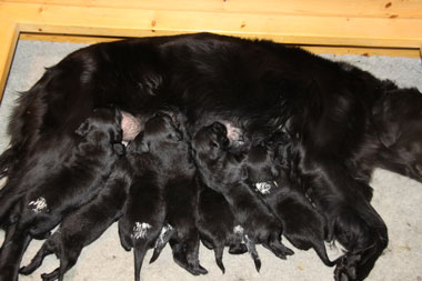 27.01.11 . 3 døgn gamle. Og nå er det heldigvis ro i kassen.Natten har vært helt skjønn for både Nikita og meg. Bare de naturlige våkningene ca hver 2 time for mat. Har ikke måtte reise meg heller men har kunnet ligge å sett på at alle får melk :-)Uff i går mistet vi to av guttene. Det var ikke noe gøy. Nikita viste nok mer en oss, for hun la den ene i min seng så jeg skulle ta vare på den natten før. Men naturen må jo styre dette.Så man får dessverre ikke gjort så mye med slikt. De andre 7 trolla spiser godt alle sammen og det er så utrolig deilig. Så nå håper vi at det bare blir glede her videre. Nikita har også slått seg helt til ro nå. Så nå tror jeg ting er slik det skal være.Alle har lagt godt på seg over natten :-) Her er Lea & Zalto