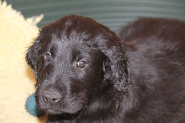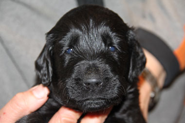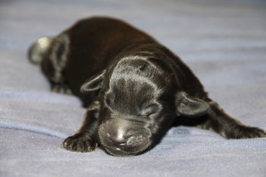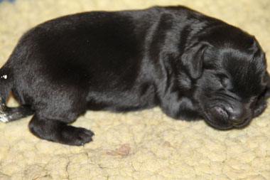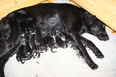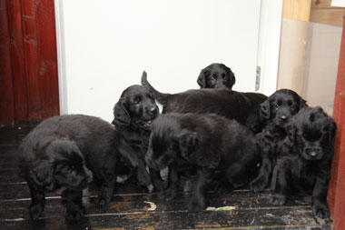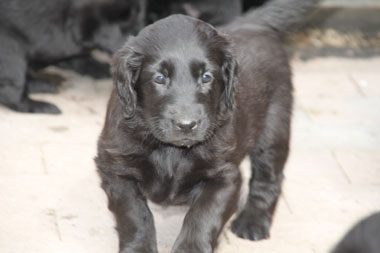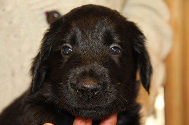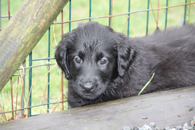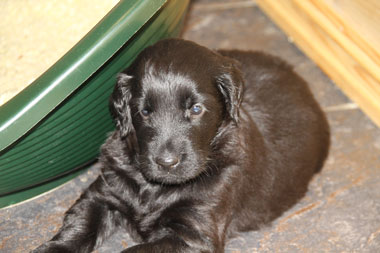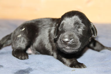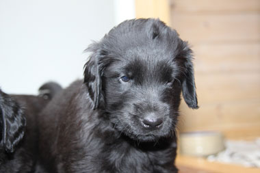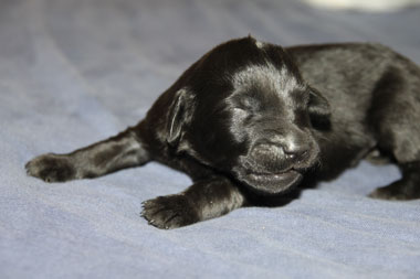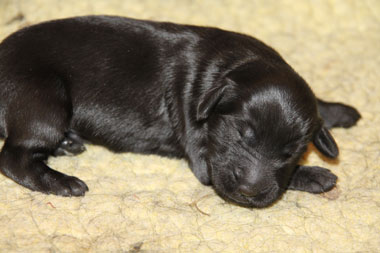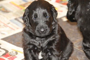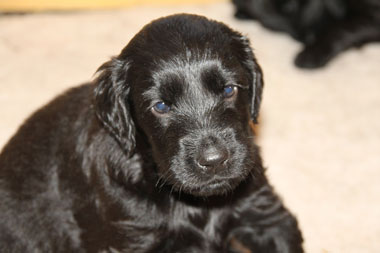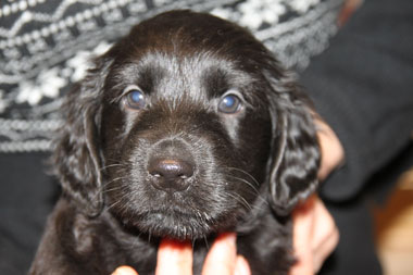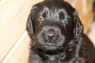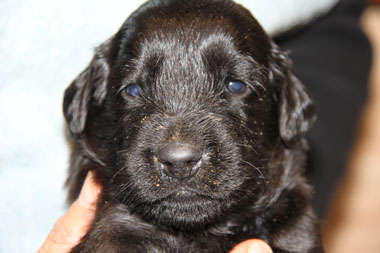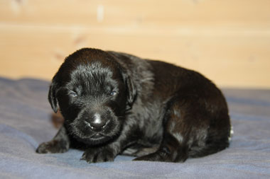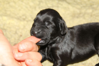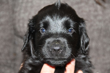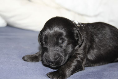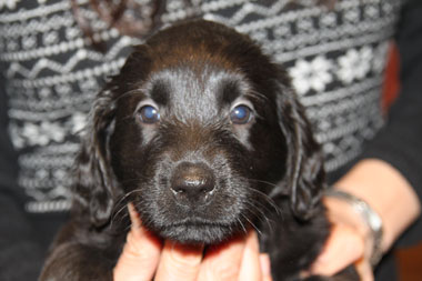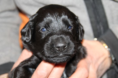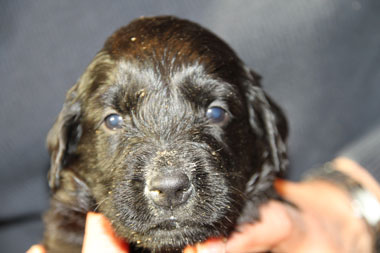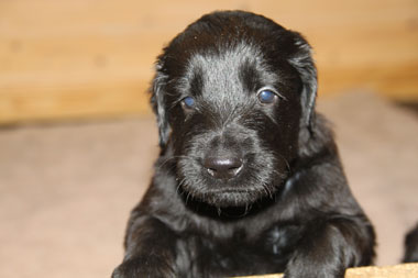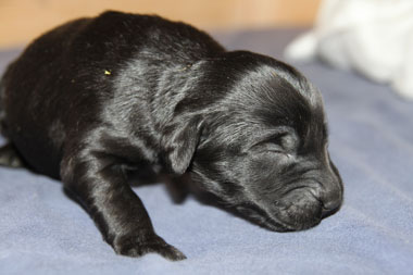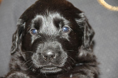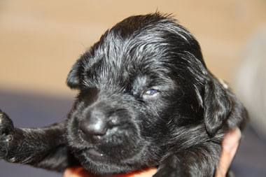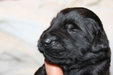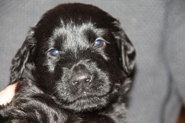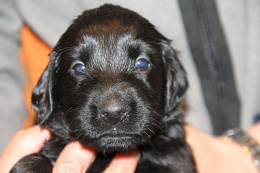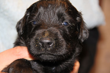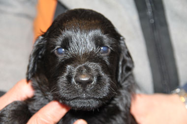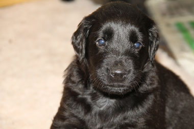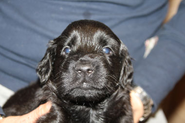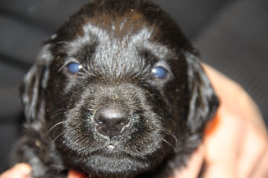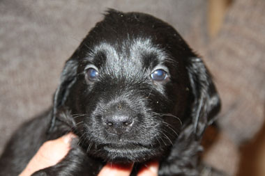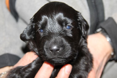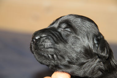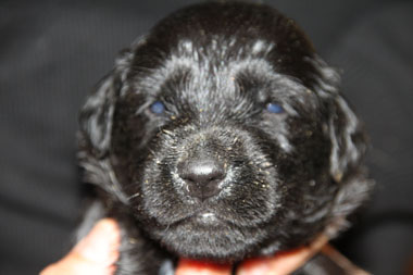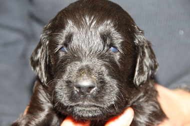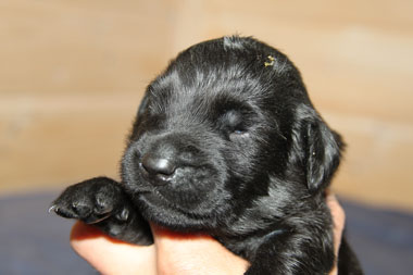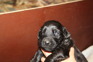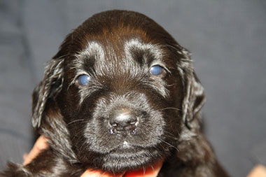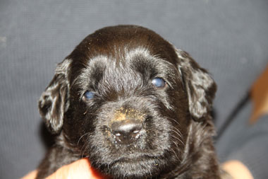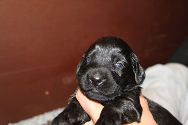 23.03.12. Nå er det så det glipper så vidt i øyen kroken til flere. Å det er så spennende. De har knall blå øyne de første ukene. Fargen går så over i en grå nyanse før den blir nøttebrun til slut. Det er vel ikke noe som er nydligere en øynene til en herlig flat coated retriever. :-) Det r ikke så lett å se for de kniper litt når jeg tar bilde med blitsen. Her er Harley & Zico