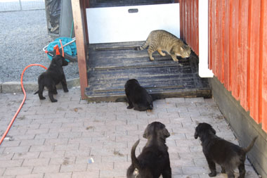 29.04.12. I går var det knall vær å det satte piraja gjengen stor pris på. Håper det blir like bra i dag. de er forresten blitt flinkere til å ikke bite så hardt i bena våres nå. Hjelper med litt nei trening :-) De er blitt flinke til å leke med de små også nå. Stopper når de skjønner at de tar i for hardt. Så alle 17 koser seg masse ute sammen. Her er Zimba & Minna så er det mange ute å leker.