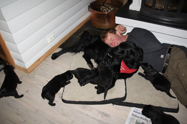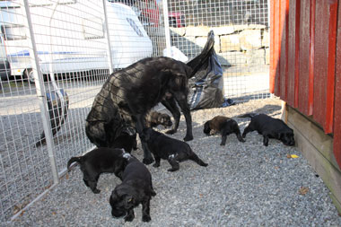 04.05.12.Phu en fæl dag spør du meg. Men skjønner at det må til å det er fantastiske familier som venter på sine skjønne små troll. Og merker at de er modne for egne hjem nå. De elsker å bli kosa med å få all oppmerksomheten alene. I går klarte de det store. Da fikset de en tivoli radio til 1800 kr. Ganske så hjelpsomme og kreative. Radioen er i hvert fall stein død. Så det var den. I dag skal vi først i begravelse før Kjell ,lhea & Zaga setter nesen mot Bergen å jakt prøve og Merethe og jeg blir her med valpene.Så reiser jo Zack & Alpha. Å du som jeg gruer meg;-)Nå er både mor og barn nybadet. det var det siste vi gjorde i går kveld så de fikk tørke godt inne før de skulle ut å leke igjen i dag. De var så fulle av jord og alt mulig rart de har jobbet med at det måtte de bare. men det gikk kjempe fint med alle :-)Her er Milli & Alpha
