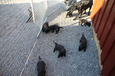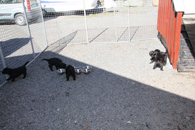 03.05.12.En dag igjen med 7 stykker. I morgen reiser de 2 første. Litt rart. I går var det også kjempe deilig å varmt. Men nesten litt for varmt for trollungene. De tyr til skyggen å koser seg der. Rent nytt teppe tok de med seg ut. Kjempe gøy ........Utrolig hva som fenger å finne på. Mie var en del ute i hundegården i går. Hun er ikke redd og da er valpene mye mer forsiktige når hun bare er der når de forsiktig lurer å snuser på det dyret som plutselig hopper inn fra en eller annen kant. De er jo vant til kattene inne men ute det var litt rart tror jeg. Hun spretter jo opp å ned på rekkeverk og søppel bøtter også ,så det er litt vanskelig for de å skjønne hvor er hun egentlig nå da :-) Var kjempe gøy å sitte å se på hvordan de lurte å prøvde å løse det når hun var der akkurat ,å visp så var hun borte. De tittet jo ikke en halv meter opp på rekeverket. Rare greier dette her .Her er Minna & Zack