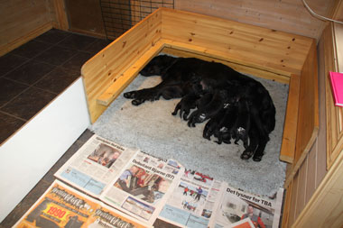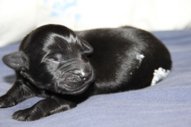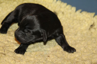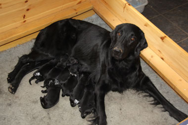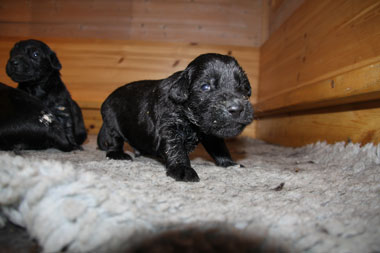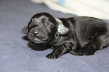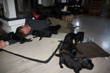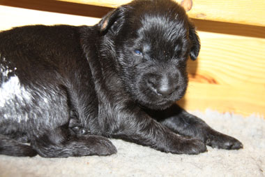 13.03.12. Alle små trolla har lagt på seg. Sjekket det tidligere i dag og det er alltid spennende å se om de suger skikkelig eller om de bare ligger å sutte koser på puppen. Det er de 3 første døgnene som man ser om det er noen som faller fra og ikke er utviklet nok for den store verden. Så jeg synes det er så deilig når jeg ser at vekten øker kjapt. Shania stor koser seg. Hun er kjempe flink. Virker som hun har god greie på hvor alle er når hun er ute av kassen en kjapp tur og skal legge seg ned igjen. Valpene er rolige og fine. Ingen sutring og det er så deilig.De er utrolig silkesvarte alle sammen. Man kan nesten speile seg i den nydelige pelsen de har. Her er Zimba & Zico