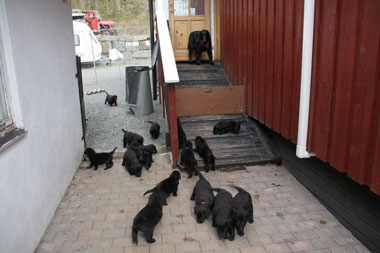 21.04.12. Nå begynner X gjengen å bli litt bølle frø de også :-) Tennene sitter i benet på meg når jeg rydder ute. Men de skjønner heldigvis fort at det var faktisk ikke lov. Men du man kjenner de små synålene i ankelen når de henger seg fast for å leke. Scottern synes barna sine begynner å bli pøbler han også. Han får så lange ben og forter seg vekk når de er på jakt etter det som henger midt under han. Nemlig tissen hans. Han får et litt rart utrykk i ansiktet da gitt :-) Kan man skjønne det. I går slapp jeg alle løs sammen ute etter maten. Spennende med den store verden når porten ble åpnet. Så nå blir det nok tåke lur når den lukkes inni mellom tenker jeg. Her er alle 17 og Scottern som har søkt tilflukt på trygg mark igjen.!!!!! Så er det Zimba & Minna