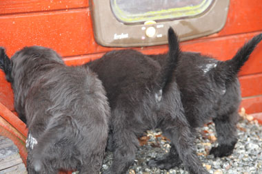 26.03.12. I dag er x gjengen blitt 2 uker gamle. Alle har åpnet øynene og de er bare helt til spise opp. I dag skal de få smake sin første lille ts med kokt hundemat som grøt. Det pleier å falle i smak. Vi starter med å gi de Norwegian polar blander med litt cultura. Etter hvert så blander vi inn Eukanuba . Men ikke den første tiden. Scottern var litt for ivrig i går også på prøven å fikk en 0. Men vi får trene videre få lydigheten ved fot å få dette helt på plass :-) Han har i hvertfall lært utrolig mye denne helgen. Vilt behandlingen hans er også kjempe fin. Myk i munnen og lever fint i hånden. Men han blir for ivrig når han går på linje med 3 til som også skal jobbe . Scott kunne mer en gjerne tenkt seg å hentet alt selv. Arbeids kapasiteten er det i hvert fall ikke noe i veien med. Her er Alpha & Harley