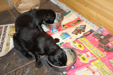 28.03.12. Alle fikk også i går smake et par ts med hundemat. Det er så godt. De snuser rundt teppet lenge etter på i håp om å kunne få litt mer. Skal prøve så vidt med en liten skål på en og en i dag. Det er jo ikke så mye de får enda ,men bordskikken er grei å trene på tidlig :-) Her erMinna & Zack