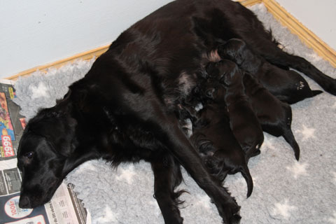 23.10.19. Nå tror jeg fødsel er over. den siste morkaken er kommet og Giga tar livet veldig med ro. Vi følger så klart med videre hvis det skulle ligge noen godt gjemt under ribbene :-)Giga Har tatt seg et bad og fått nytt rent teppe. Hun koser seg med sine skjønne små. Det er vi som har malt de med hvite prikker for å se forskjell på de :-)Her er Giga med sine skjønne små barn.