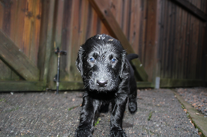 14.10.25. Utviklingen går i 100 her. I dag må vi åpne mer plass . De er blitt sykt flinke til å gå ut på avisene å gjøre i fra seg. I dag skal de få "gressplen" ved døren .jeg skjønner faktisk ikke hvordan folk klarer å ha valper  i en liten valpekasse frem til 3 ukers alder. For her går det unna. De våkner å går helt ned i andre enden av innhegningen sin . Å de vokser så det knaker så det blir jo fort trangt. Hørselen har nå åpnet seg å de hører veldig godt når vi kommer inn i rommet. Da blir det liv :-)Her er gutt halen og gutt hode