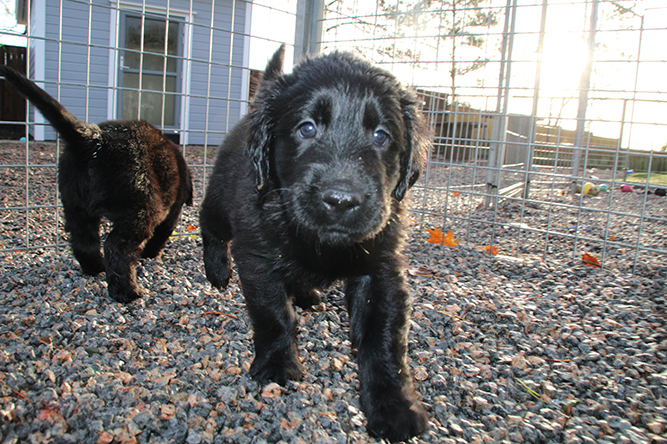 14.10.25. Utviklingen går i 100 her. I dag må vi åpne mer plass . De er blitt sykt flinke til å gå ut på avisene å gjøre i fra seg. I dag skal de få "gressplen" ved døren .jeg skjønner faktisk ikke hvordan folk klarer å ha valper  i en liten valpekasse frem til 3 ukers alder. For her går det unna. De våkner å går helt ned i andre enden av innhegningen sin . Å de vokser så det knaker så det blir jo fort trangt. Hørselen har nå åpnet seg å de hører veldig godt når vi kommer inn i rommet. Da blir det liv :-)Her er gutt halen og gutt hode