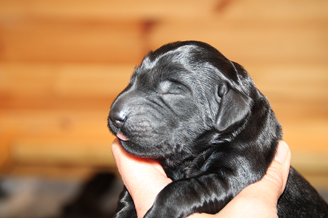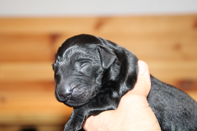 04.10.25. I dag er de skjønne små blitt en uke gamle. Klo klippen ble gjort i går kveld og det gikk fint . Selv om de ikke akkurat sitter rolig når jeg prøver å klippe klørne :-) I dag er det mark kur på menyen. Den må de ha 4 ganger før de skal flytte herifra . Smaker aldri så godt men lurer det i de. Kimmie sin temperatur er mye bedre. Hun har litt  mindre melk foreløpig etter infeksjonen  så vi hjelper til med flaske hver 3 - 4 time så alle får i seg nok. De koser seg med den ekstra melken å er så fornøyde :-)Nå klokken 03.30 er stormen på full fart her ute. Så turte ikke vente med å sende ut valpedagboken i tilfelle nett og strøm forsvinner etter hvert her .Det uler i huset men hundene tar det helt med ro. Her er Gutt merket nakken og jente merket rygg.
