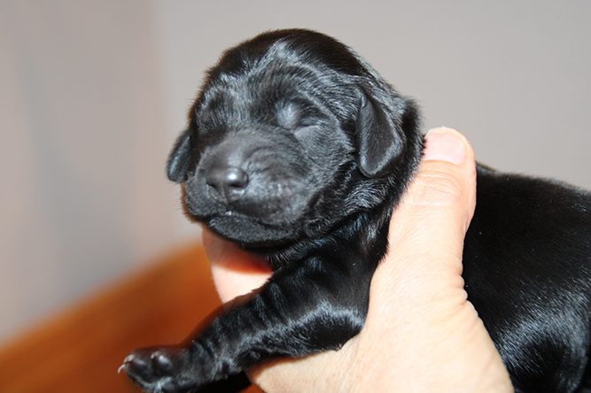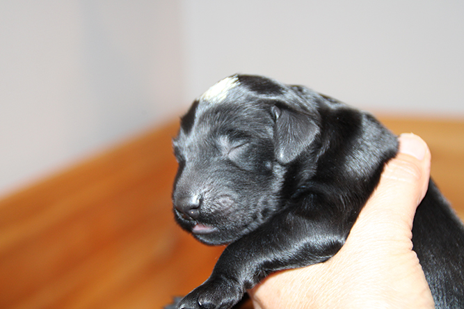 04.10.25. I dag er de skjønne små blitt en uke gamle. Klo klippen ble gjort i går kveld og det gikk fint . Selv om de ikke akkurat sitter rolig når jeg prøver å klippe klørne :-) I dag er det mark kur på menyen. Den må de ha 4 ganger før de skal flytte herifra . Smaker aldri så godt men lurer det i de. Kimmie sin temperatur er mye bedre. Hun har litt  mindre melk foreløpig etter infeksjonen  så vi hjelper til med flaske hver 3 - 4 time så alle får i seg nok. De koser seg med den ekstra melken å er så fornøyde :-)Nå klokken 03.30 er stormen på full fart her ute. Så turte ikke vente med å sende ut valpedagboken i tilfelle nett og strøm forsvinner etter hvert her .Det uler i huset men hundene tar det helt med ro. Her er Gutt merket nakken og jente merket rygg.