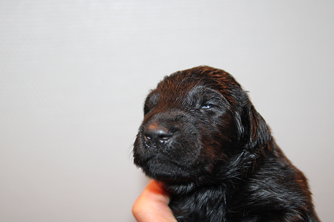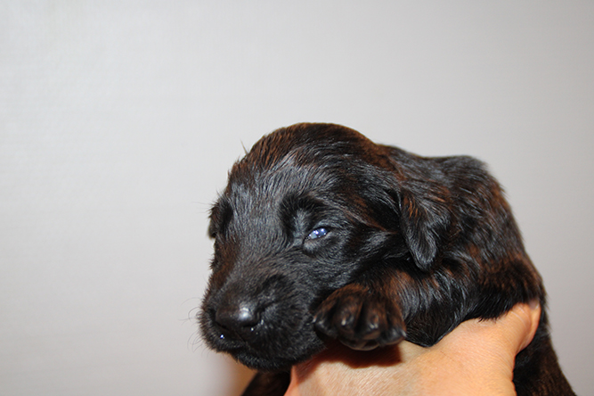 04.10.25. I dag er de skjønne små blitt en uke gamle. Klo klippen ble gjort i går kveld og det gikk fint . Selv om de ikke akkurat sitter rolig når jeg prøver å klippe klørne :-) I dag er det mark kur på menyen. Den må de ha 4 ganger før de skal flytte herifra . Smaker aldri så godt men lurer det i de. Kimmie sin temperatur er mye bedre. Hun har litt mindre melk foreløpig etter infeksjonen så vi hjelper til med flaske hver 3 - 4 time så alle får i seg nok. De koser seg med den ekstra melken å er så fornøyde :-)Nå klokken 03.30 er stormen på full fart her ute. Så turte ikke vente med å sende ut valpedagboken i tilfelle nett og strøm forsvinner etter hvert her .Det uler i huset men hundene tar det helt med ro. Her er Gutt merket nakken og jente merket rygg.