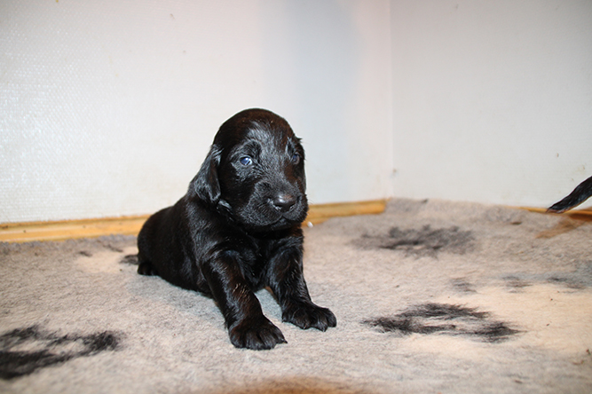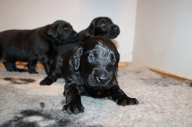 14.10.25. Utviklingen går i 100 her. I dag må vi åpne mer plass . De er blitt sykt flinke til å gå ut på avisene å gjøre i fra seg. I dag skal de få "gressplen" ved døren .jeg skjønner faktisk ikke hvordan folk klarer å ha valper i en liten valpekasse frem til 3 ukers alder. For her går det unna. De våkner å går helt ned i andre enden av innhegningen sin . Å de vokser så det knaker så det blir jo fort trangt. Hørselen har nå åpnet seg å de hører veldig godt når vi kommer inn i rommet. Da blir det liv :-)Her er gutt halen og gutt hode