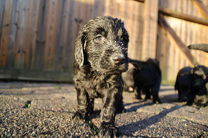 14.10.25. Utviklingen går i 100 her. I dag må vi åpne mer plass . De er blitt sykt flinke til å gå ut på avisene å gjøre i fra seg. I dag skal de få "gressplen" ved døren .jeg skjønner faktisk ikke hvordan folk klarer å ha valper  i en liten valpekasse frem til 3 ukers alder. For her går det unna. De våkner å går helt ned i andre enden av innhegningen sin . Å de vokser så det knaker så det blir jo fort trangt. Hørselen har nå åpnet seg å de hører veldig godt når vi kommer inn i rommet. Da blir det liv :-)Her er gutt halen og gutt hode