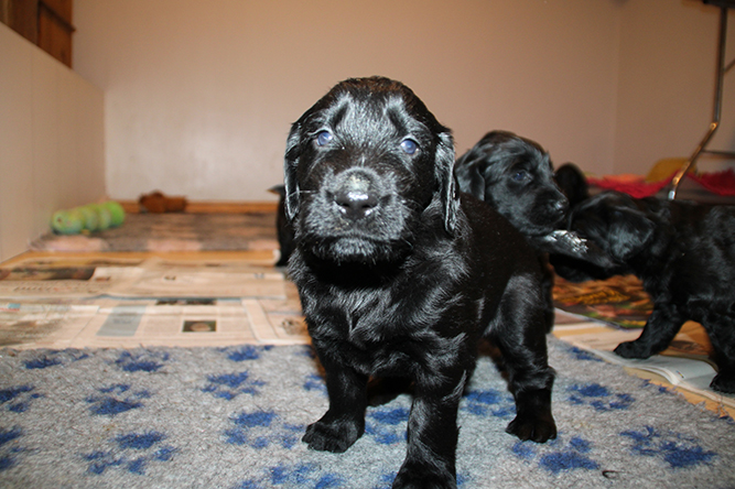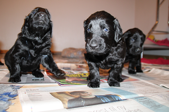 25.02.26. Tenk i dag er de skjønne sorte gullene våres blitt 2 uker gamle. Vi åpnet opp valpekassen så de fikk større plass i går. Nytt teppe var også deilig :-) Luna har virkelig strukket seg å kost seg i natt sammen med bebisene sine . Det var vel trangt nå. Vi har en liten del med aviser og i løpet av de neste dagene nå vil de begynne å trekke vekk fra der de sover for å tisse og bæsje. det er en naturlig renslighet som er viktig å ta vare på. Å la de ha plass til å komme seg ut for å gjøre i fra seg :-) I dag er det klo klipp på hele gjenget igjen. vekten øker så det suser . I dag skal de få smake sin første beby valpemat. Royal canin starter mouse. Det pleier å bli veldig populært . Her er JN og Gn