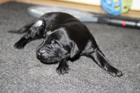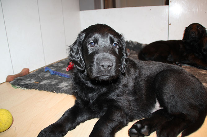 27.09.20 mat i tre omganger falt veldig i smak. Nå tror jeg faktisk jeg må åpne valpe kassen enda mer så de får større plass å bevege seg på her :-) I går gikk onkel Scott . Emma bror på jakt prøve og fikk en meget god 2 premie. :-) Kjempe gøy. Tror Emma gleder seg til hun kan jobbe igjen også. Hun byr villig frem ballen og lurer på om vi skal gå ut å gjøre noe når små trolla sover . Her er Guttnakke og jente halen.
