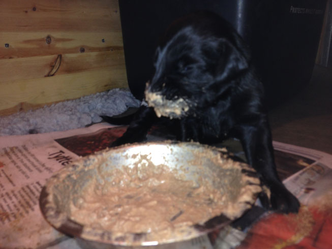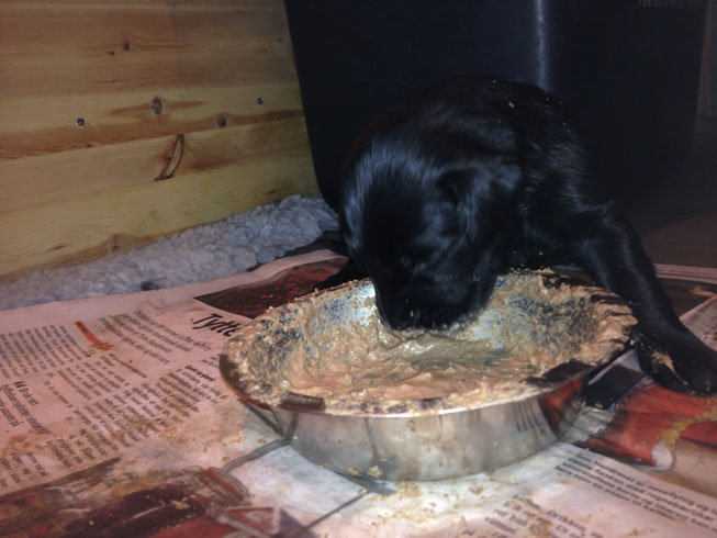 02.10.13.Bordskikken må nok øves en smule på spør du meg :-) De blir helt ville når de får lukten av mat og prøver å få hele kroppen samtidig oppi all den gode maten. Men med litt hjelp for en og en så klarte vi etter hvert å spise nogenlunde pent :-) Ny runde i dag ,å tenker det er noen små troll som gleder seg jeg. Millie er i hvertfall stor fornøyd når de har badet i matfatet. Tenk så mye deilig mat å vaske vekk da :-)