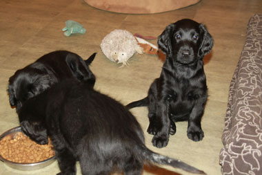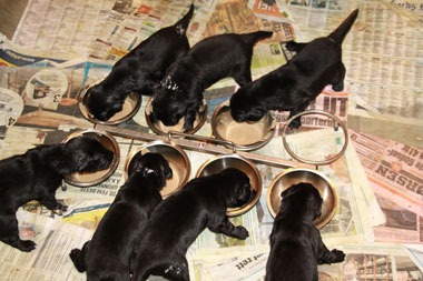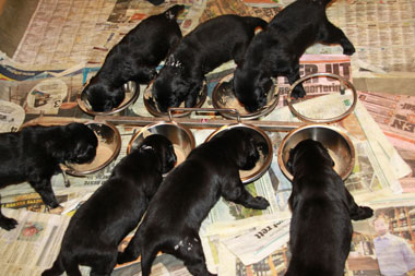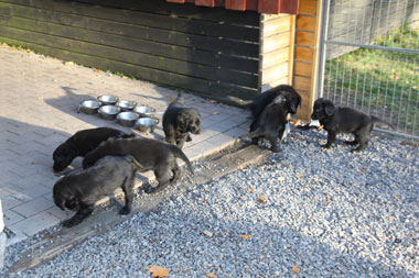 07.10.13. I går fikk alle mat av hver sin mat skål. Og Ypppi. det funket ganske så bra. Vi må jo sitte å passe på at de holder seg i sin matskål og ikke oppi naboen s . Men jammen er de blitt flinke. Med besøk i går også så var de med en tur i stua. Der vr det også en ny stor verden. Jente rumpe vandret en liten tur ut når jeg hadde døren oppe fra valperommet og vasket og ryddet aviser. Ganske så trygge små troll.:-) Her er alle som spiser.