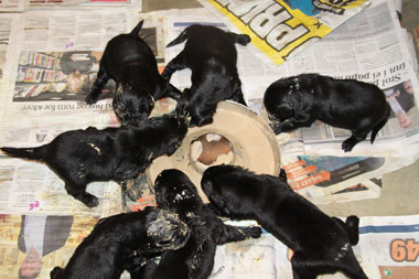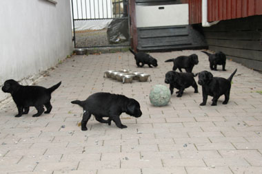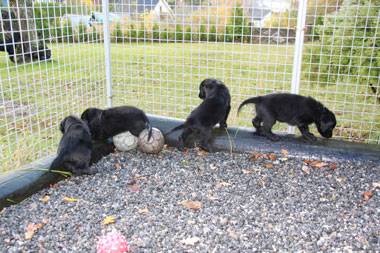 19.10.13. I dag er valpene blitt 5 uker gamle. I går ble de registrert i NKK og fikk hvert sitt reg nr. Det står under tidligere valpekull B kull :-) I dag er det ny runde med klo klipp ,mark kur og vekt sjekk :-) Her er alle ute å koser seg. Veldig spennende med Scottern uten for hundegården. Han er ofte innom på valperommet å gir de en sleik eller to så de forguder jo han :-)Millie koser seg med lek med trolla sine.Så er det Kaya & Kompis