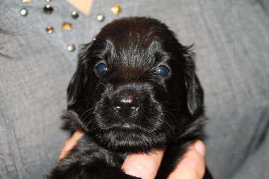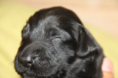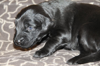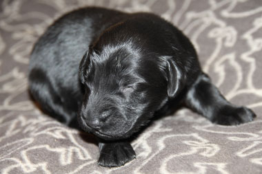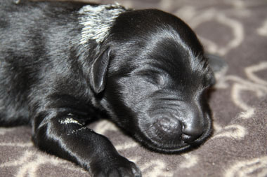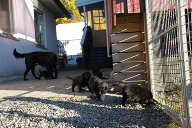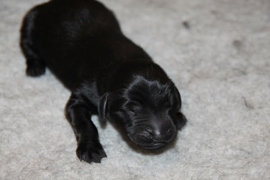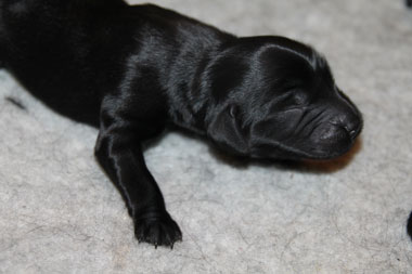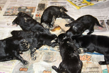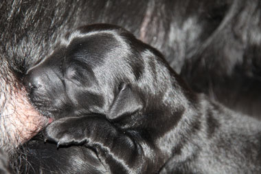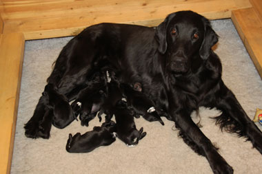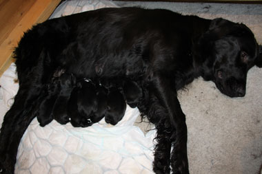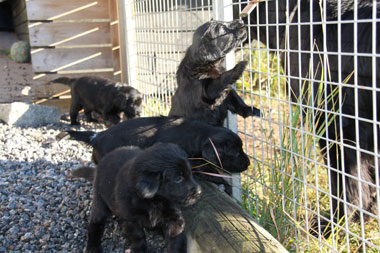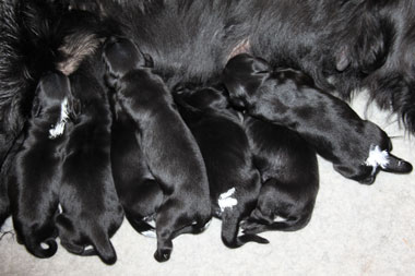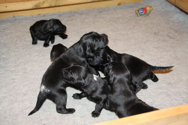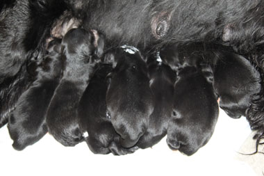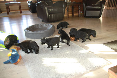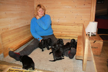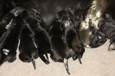 14.09.13. Da tror jeg at alle er født. Millie har fremdeles noen veer men vi mangler 4 morkaker så det er antagligvis disse som er på vei ut.,men det kan være en valp til også, så vi får bare sitte å vente å se hva som skjer. Millie er rolig og har dusjet seg og vært ute en tur. Hun er en meget rolig og herlig mamma. Som stor koser seg med de skjønne små.Alle drikker godt med melk og er så fornøyde. Silkesvarte og bare helt til å spise opp :-)