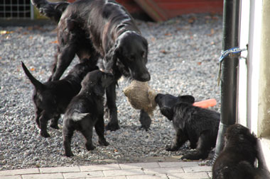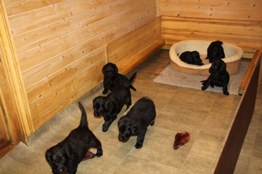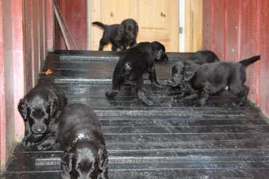 30.09.13. I går åpnet vi opp slik at valpene fikk større plass.Det var ny stor verden det.De skjønner ikke helt at de skal ha med seg hele kroppen utpå avisen enda.De drar/vagger seg med forkroppen over på avisen for så å tisse. Hmf. men bakparten er jo fremdeles godt plantet på teppe :- Det tar ikke mange dagene før de skjønner at de må gå med hele kroppen over på avisene :-)De fikk også smake sin første mat i går. det var kjempe populært :-)Her har Lhea startet løpetid så da skjønner man jo de rare faktene på jakt prøven. :-) Både på ung gutten Jonas som er en smule ør i hodet av dronningens lukter og Dronning Lhea som satte propper i ørene i går :-) Et Stort grattis til Ingrid Andren & Hans Westblad med norsk jakt champion i går :-) I dag har jeg tatt bilde av Cava ogZofus :-)