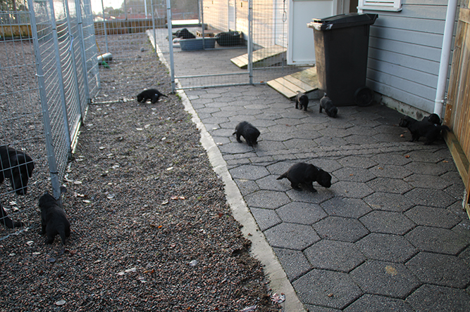 28.10.21. Det er fart i de små sorte gullende når de våkner nå. De åler seg fort gjennom valpekassen på leting etter puppen og melken :-) Ikke alltid like lett å få lagt seg Mille står noen ganger å ser litt fortvilet ned på haugen med skjønneste som åler rundt å funderer tydelig på hvor skal jeg legge meg fort ned så jeg ikke ligger på noen . :-) Hun er kjempe flink :-) Her er jente merket på rumpen og gutt merket på rumpen