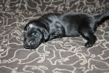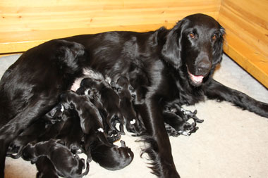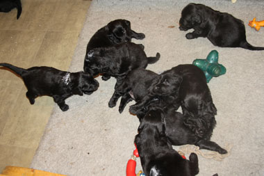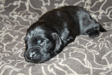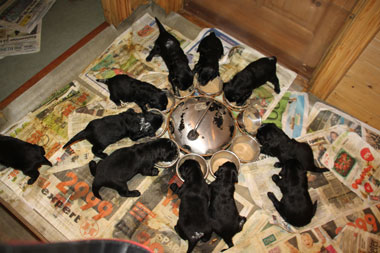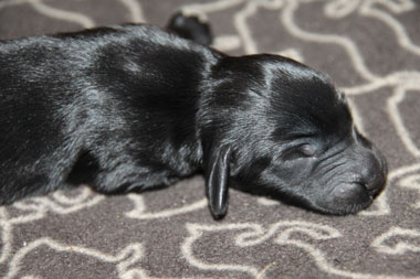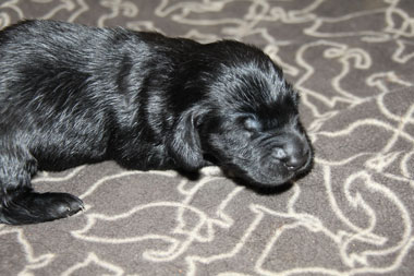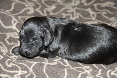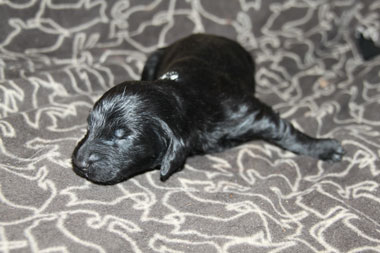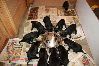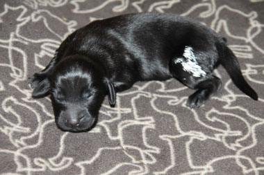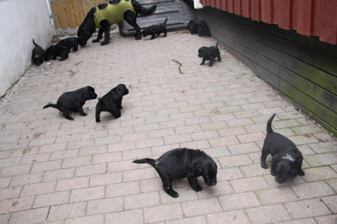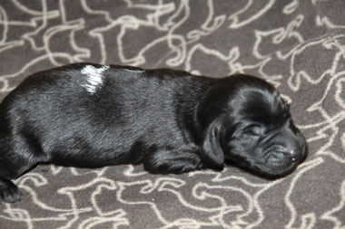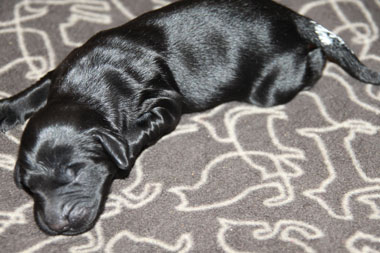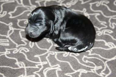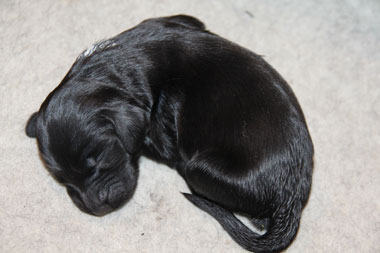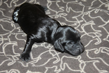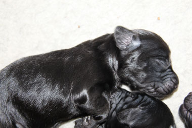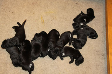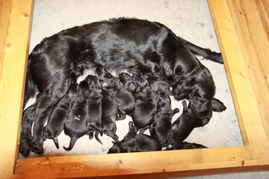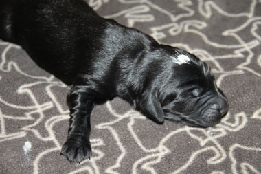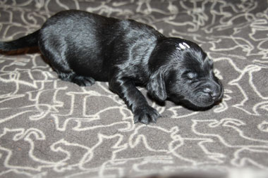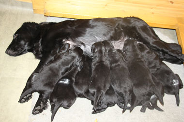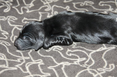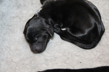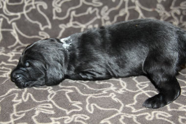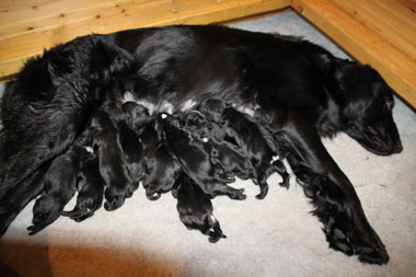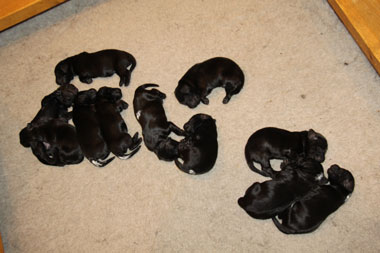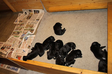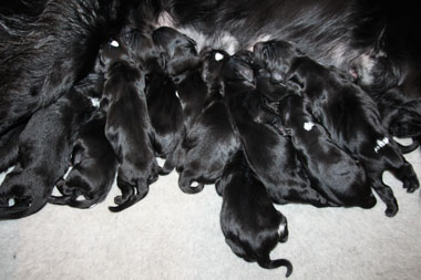 18.02.15. 1 døgn gamle er de små i dag :-)Alle hadde lagt på seg i løpet av dagen i går. Utrolig med så mange. Zelma er en tålmodig mamma som stor koser seg med sine skjønne små.Hun ligger trofast med de hele tiden, bare korte turer ut for å tissse og bæsje, så er det full fart inn igjen. Det er vi som har malt de med hvite prikker slik at vi kan se forskjell på de silkesvarte små vidunderne og følge hver og en valp nøye hele tiden :-) Her er Jente merket nakke og gutt merket nakke = JN & GN :-)