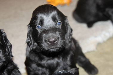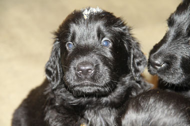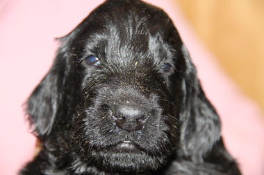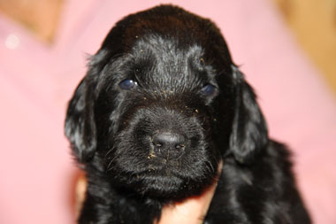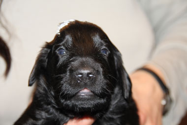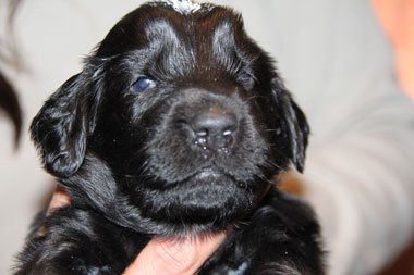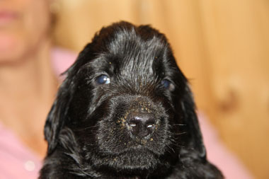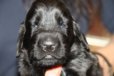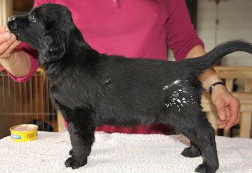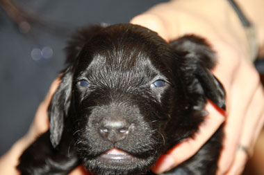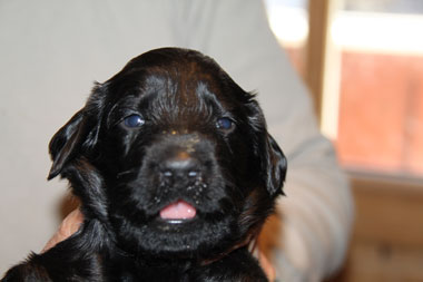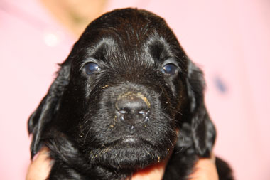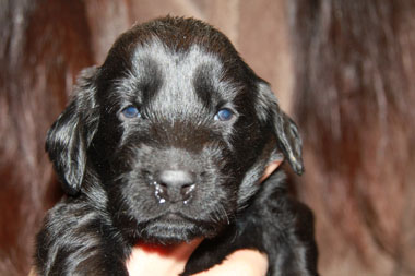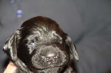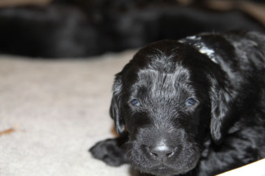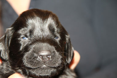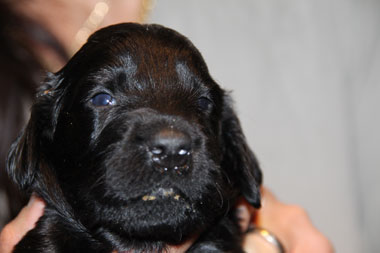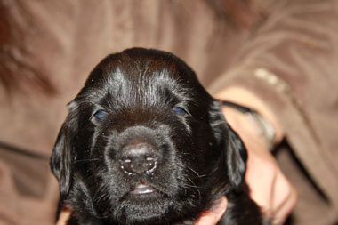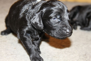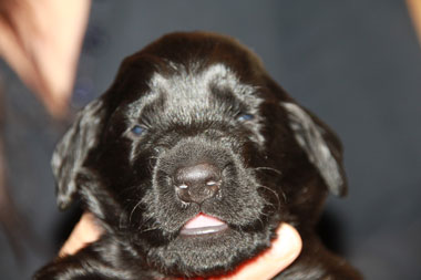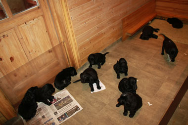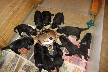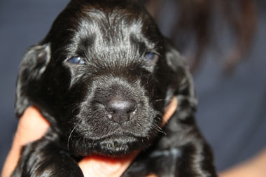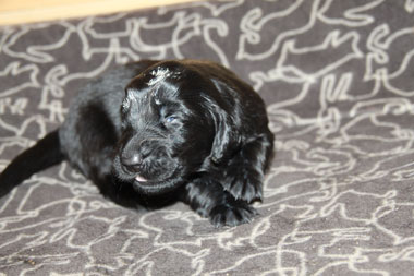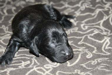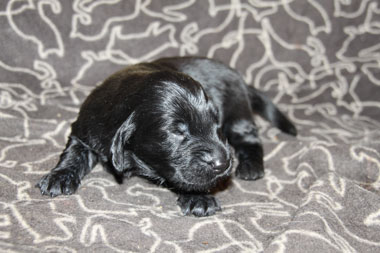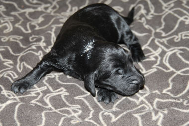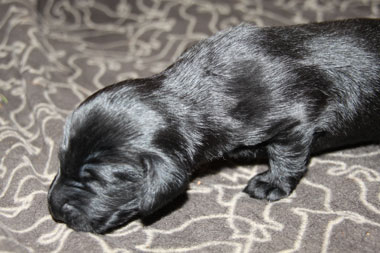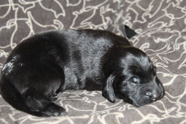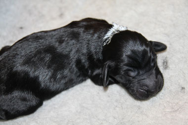 18.02.15. 1 døgn gamle er de små i dag :-)Alle hadde lagt på seg i løpet av dagen i går. Utrolig med så mange. Zelma er en tålmodig mamma som stor koser seg med sine skjønne små.Hun ligger trofast med de hele tiden, bare korte turer ut for å tissse og bæsje, så er det full fart inn igjen. Det er vi som har malt de med hvite prikker slik at vi kan se forskjell på de silkesvarte små vidunderne og følge hver og en valp nøye hele tiden :-) Her er Jente merket nakke og gutt merket nakke = JN & GN :-)